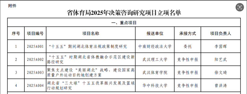 喜讯! 2025年湖北省体育局决策咨询研究项目遴选结果于近日公布,我院阳艺武教授申报的项目《“十五五”时期湖北省体教融合示范区建设新路径研究》(立项编号:2025A002)成功获批重点研究项目。本次项目的获批是阳艺武教授围绕“十五五”时期湖北省体育强省建设目标,聚焦体教融合示范区建设,为政府决策提供科学依据和实践路径的又一力作。本项目研究将结合湖北省体教融合示范区建设的实际情况,探索政策优化、资源整合和数字化赋能,为湖北竞技体育和学校体育协同发展提供新思路。 本年度项目经过行业专家评议和遴选,最终获批课题16项,其中重点课题4项,一般课题12项。此次重点项目的获批,充分彰显了阳艺武教授严谨的科研作风和学术影响力,也体现了湖北省体育局对高校智力资源的高度重视,同时也为我院体育学科高质量发展进一步夯实了基础。