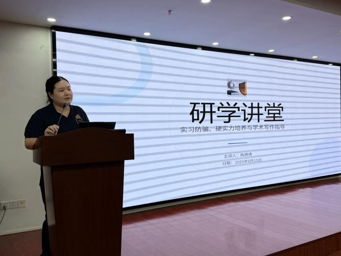 为帮助研究生有效应对实习、学业与职业发展中的关键问题,增强风险防范意识,夯实专业能力,提升学术素养,9月15日晚7点30分,学院在弘毅楼1405教室举办了2024级研究生研学讲堂活动。本次活动由2024级研究生辅导员陶倩倩主讲,2024级全体研究生参加学习。