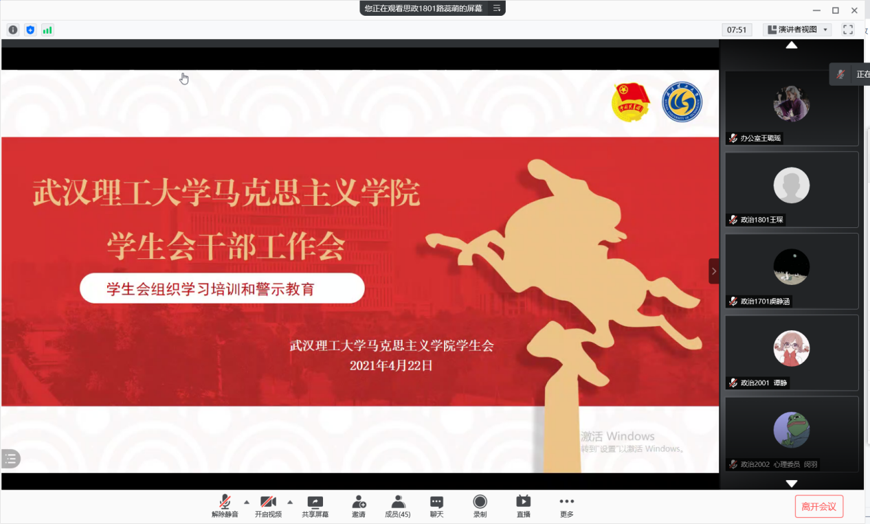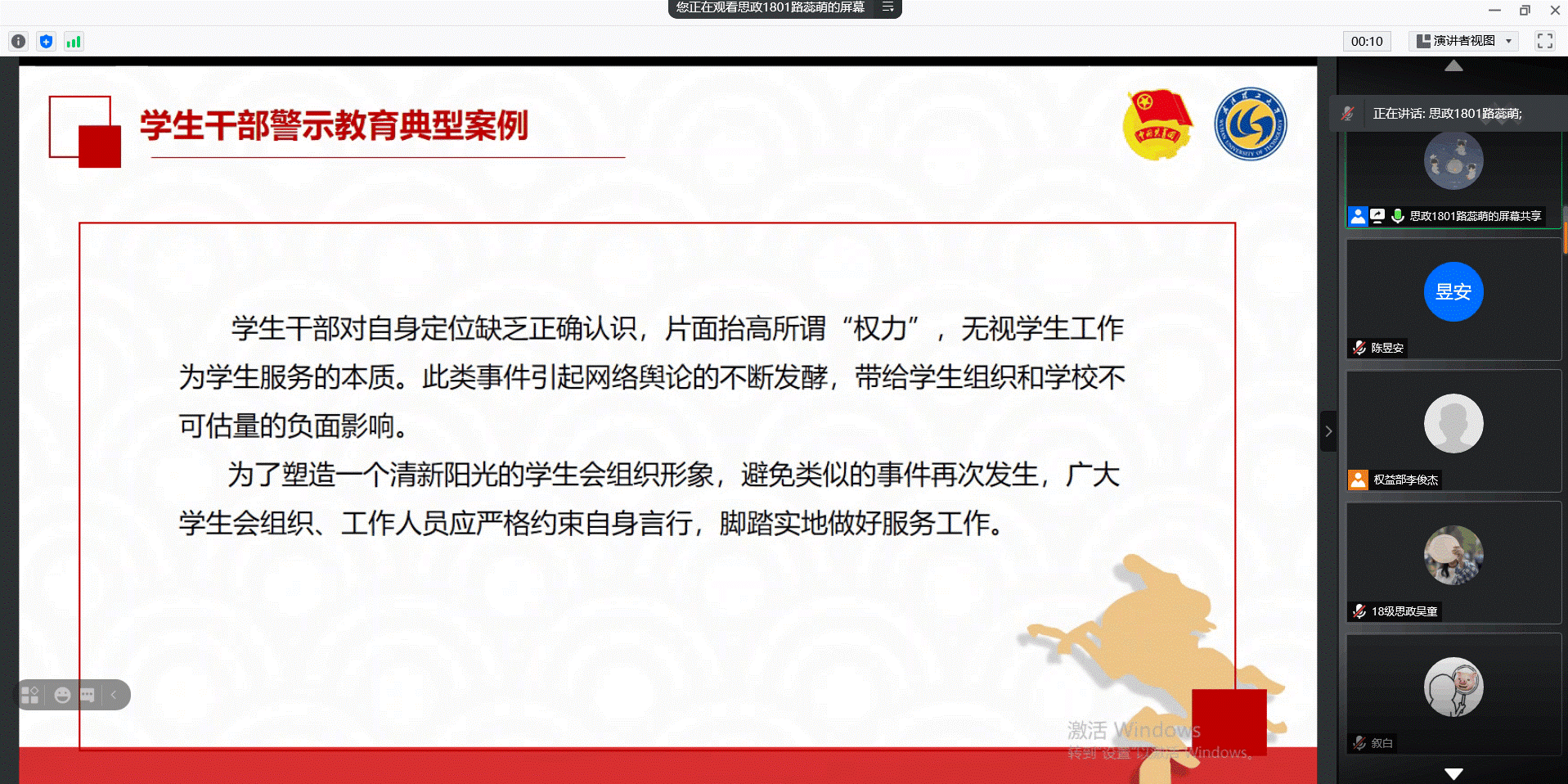为加强学生干部作风建设,提升服务本领,4月22日上午9点,学院学生会召开学生干部学习培训和警示教育线上会议。本次会议由学生会负责人路蕊萌主持,学生会各部门及各班班委会成员参加本次会议。