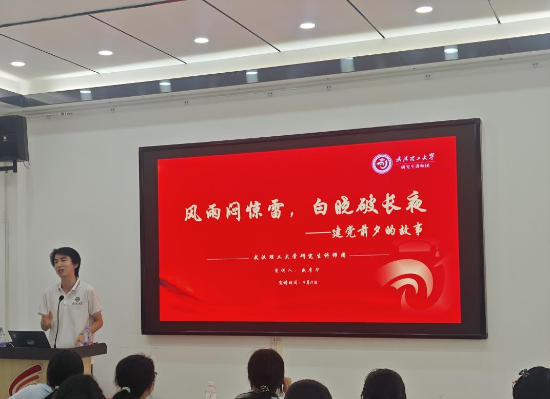 9月11日上午9点30分,武汉理工大学研究生讲师团成员盛厚华作“风雨闻惊雷,白晓破长夜”主题宣讲。宣讲内容从庆祝中国共产党成立100周年大会中习近平总书记的重要讲话开始,讲述了百年来,在中国共产党的旗帜下,一代代中国青年把青春奋斗融入党和人民事业的故事,生动展现了当代青年将个人理想融入国家发展的真实画卷。