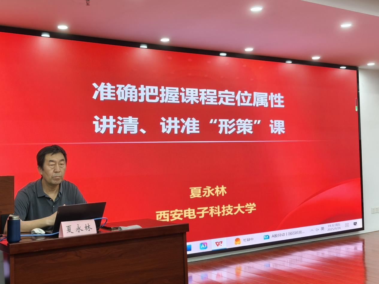 为深入落实立德树人根本任务,不断增强思政课的针对性和吸引力,学院于9月26日下午在弘毅楼1405报告厅举办“形势与政策”课集体备课会。本次报告会以《精准把握课程定位属性,讲清、讲准“形策”课》为主题,由西安电子科技大学马克思主义学院教授、硕士生导师夏永林老师主讲,学院院长雷江梅主持,学院教师、2024级全体硕、博研究生参会。
